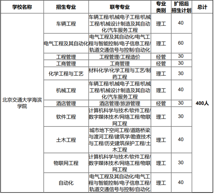 2020年扩招后的北京交通大学海滨学院招生计划人数:
